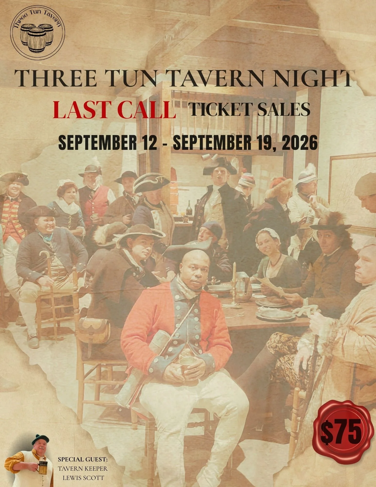 Three Tun Tavern Night will take place Saturday September 26, 2026 and begin at 7:00pm. This is a 21+ event and tickets will only be sold in advance. Period attire NOT required but encouraged.
